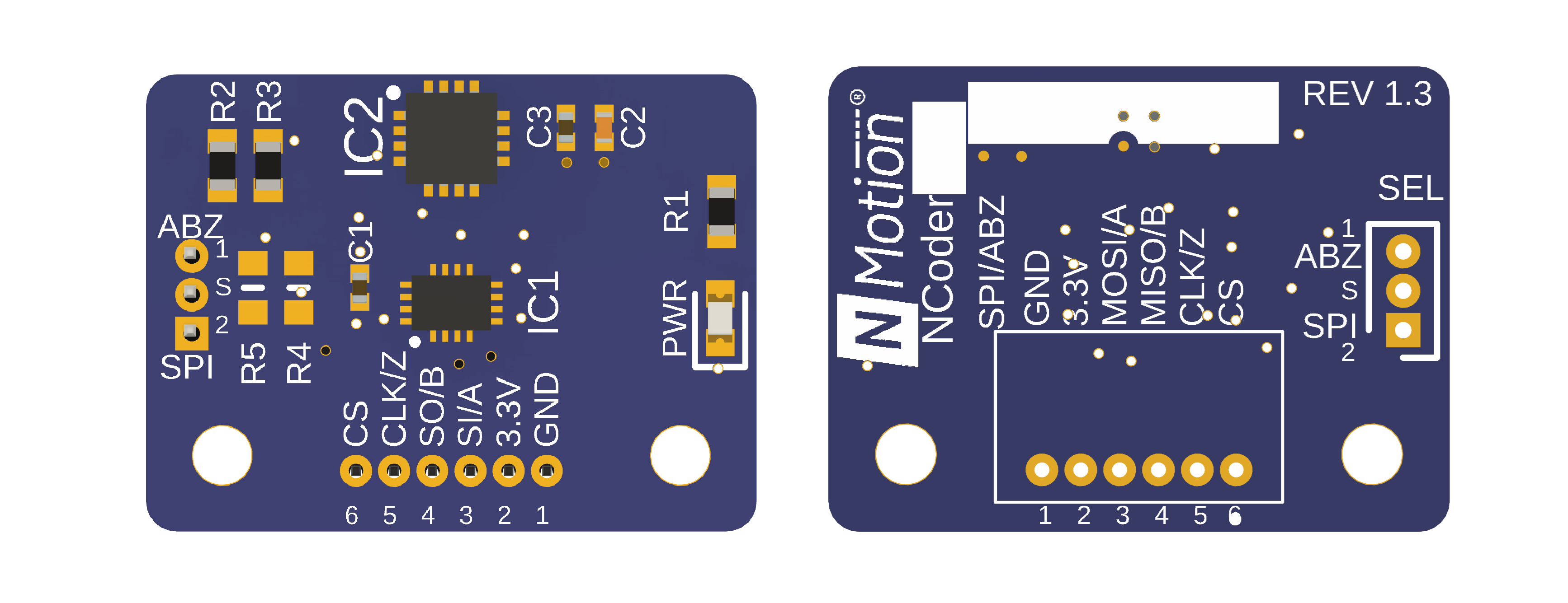 This board can operate in either Quadrature (ABZ) mode or SPI mode, selectable via the SEL jumper pins. When configured in ABZ mode using the SEL jumper, the encoder functions as a quadrature encoder with index, and the I/O pins can be connected to an external microcontroller to read the A, B, and Z signals. By default, the NCoder732 is set to output a 4096 CPR / 1024 PPR quadrature signal. Users can switch to SPI mode via the SEL pins to access advanced configuration options and absolute angle data. In SPI mode, the encoder exposes a 14-bit absolute angle and allows customization of parameters such as CPR via the SPI interface through the I/O connector.