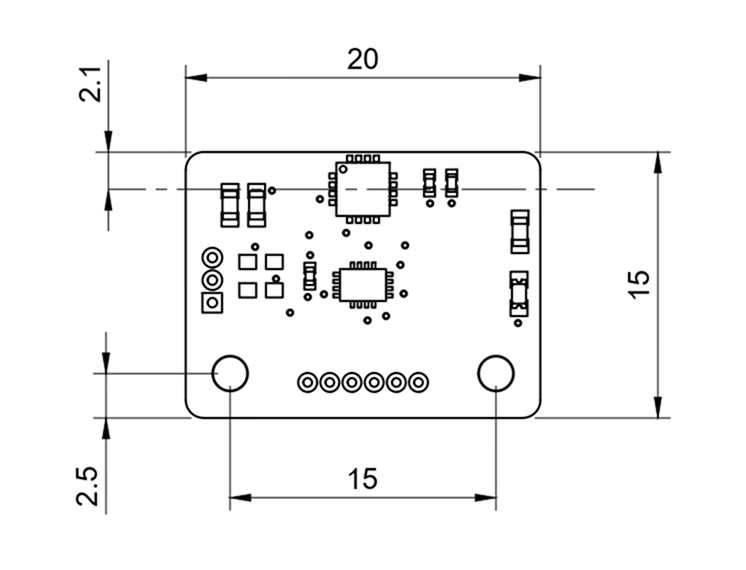 A 6 x 2.5 mm (or compatible) diametric magnet can be placed over or under the MA732 sensor and should be centered on the middle of the package with a tolerance of 0.5mm as shown in the figure below. The distance between the magnet and the package should be between 0.5-3 mm. The magnet holder must not be ferromagnetic. M2 mounting holes can be utilized for mounting the board.