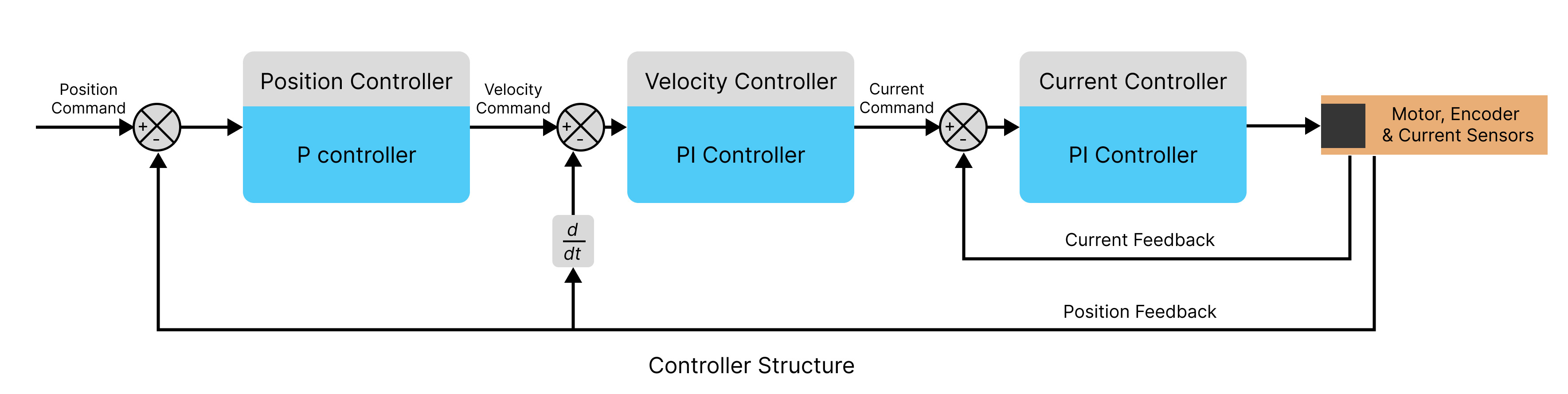 The controller in the driver is a cascading style controller with cascaded position, velocity and current control loops. When the control mode is set to position control or trajectory control, all of the cascaded controller runs. When running in velocity control mode, the position control part is removed and the velocity command is directly given to the velocity controller. Similarly, in torque control mode, only the current controller loop runs.
